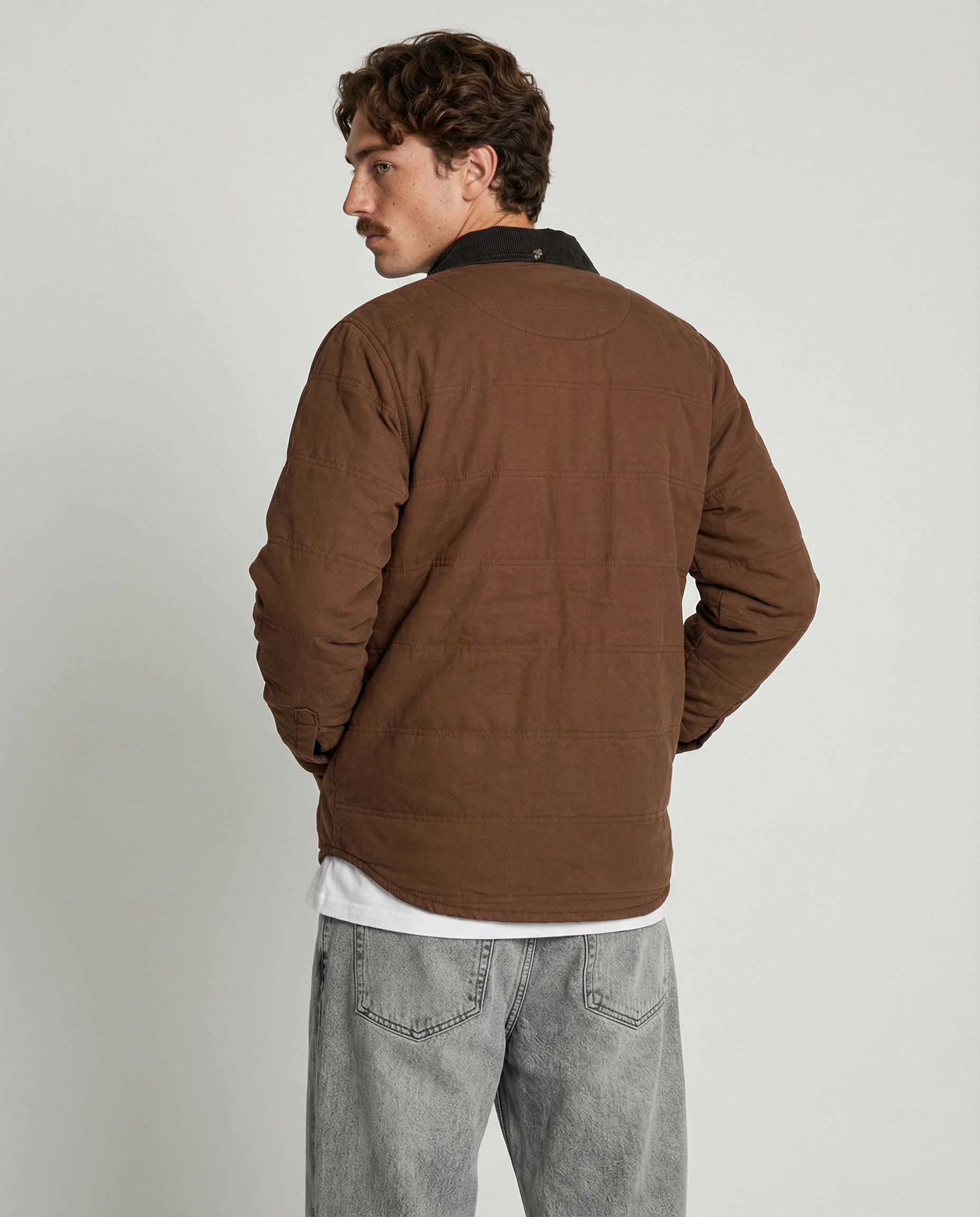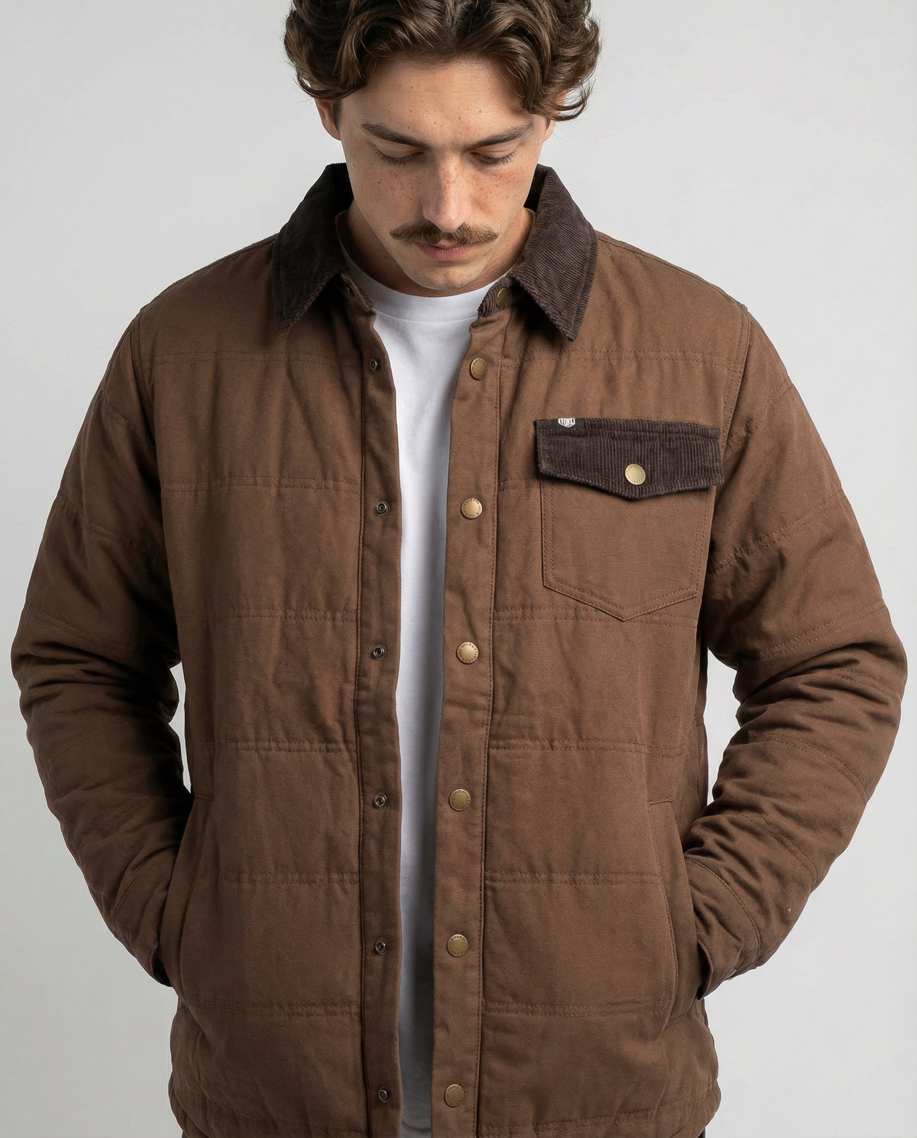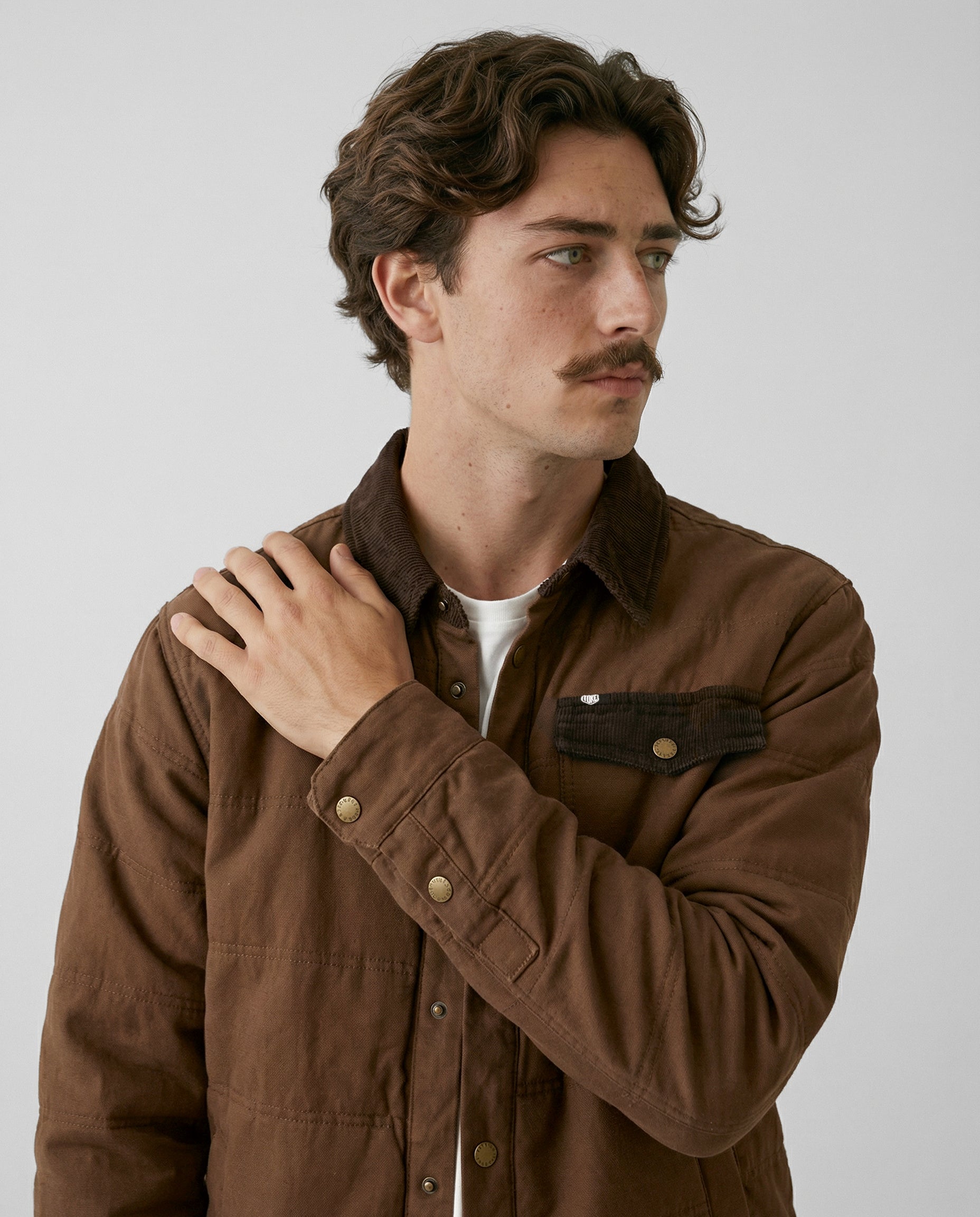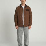 Inspirada en las camisas de trabajo tradicionales, está confeccionada 100% en algodón y cuenta con un relleno ligero que abriga sin limitar el movimiento. Sus detalles en cotelé en el cuello y la solapa del bolsillo, junto con los broches metálicos, le dan un aire clásico y auténtico que combina con todo.